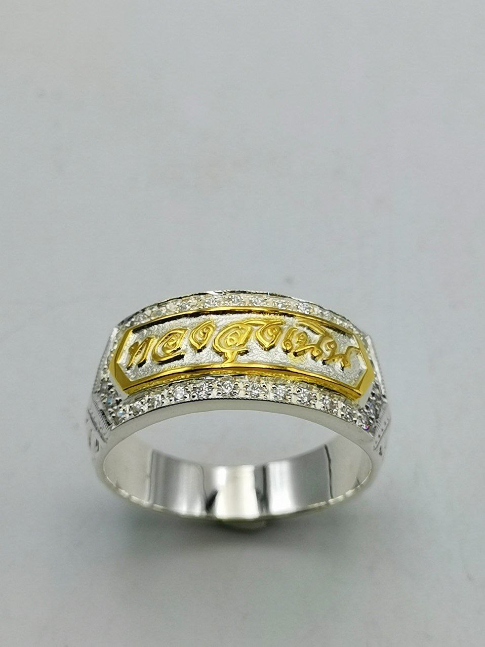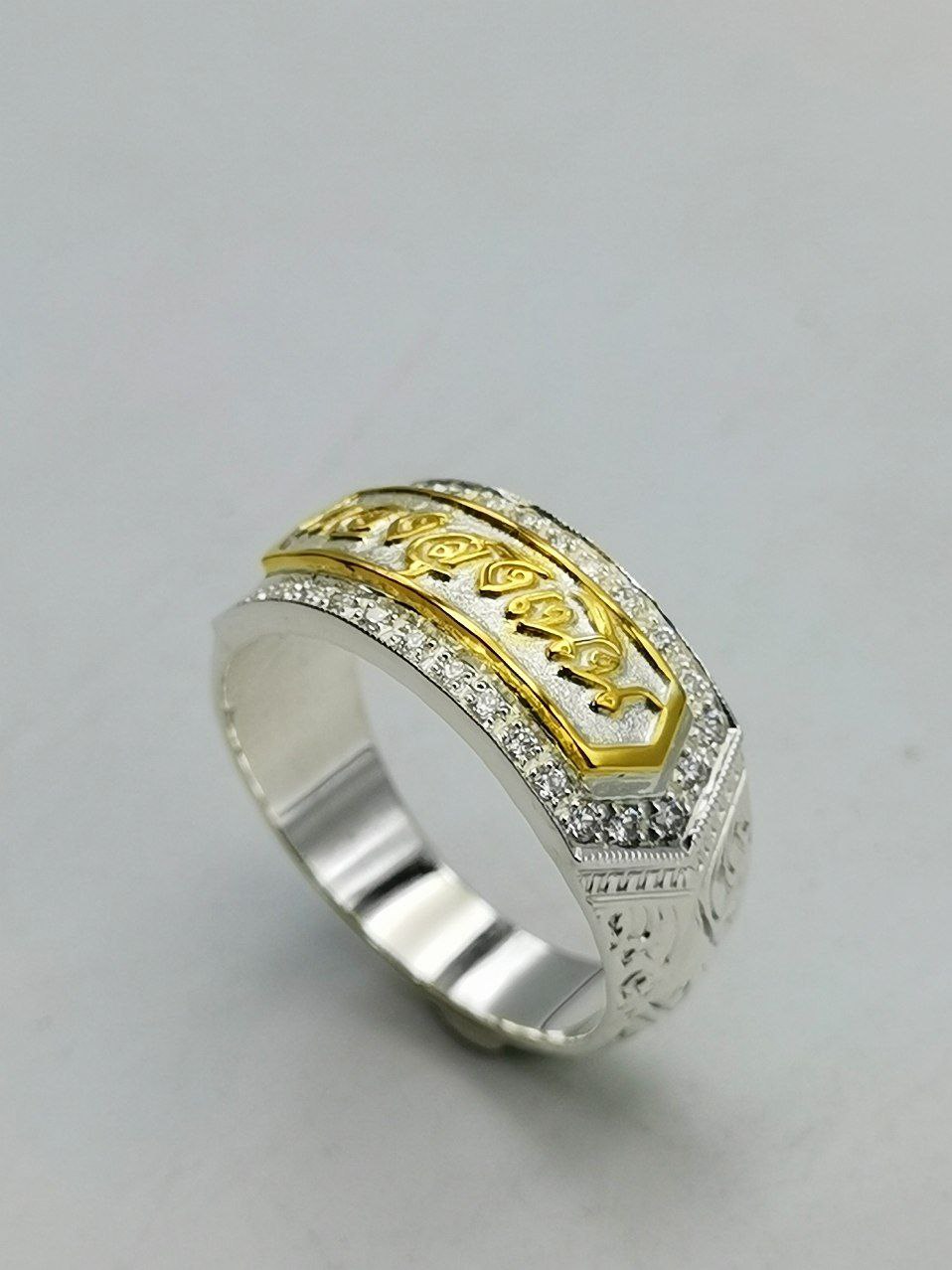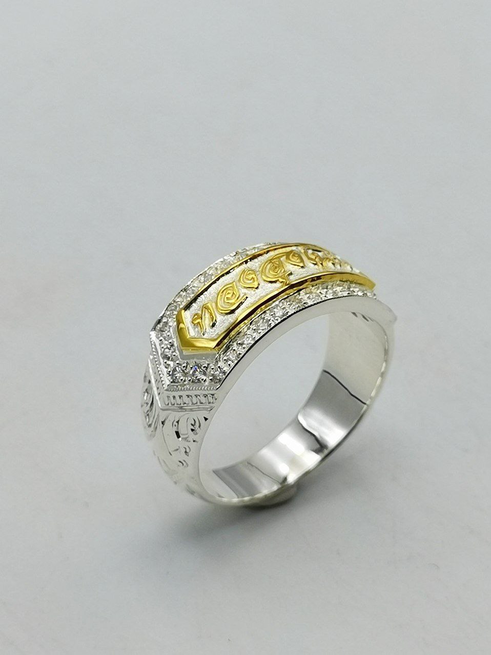 แหวนเงินสลักอักษร ฝังเพชรและเลเซอร์เพิ่มความดูซับซ้อน