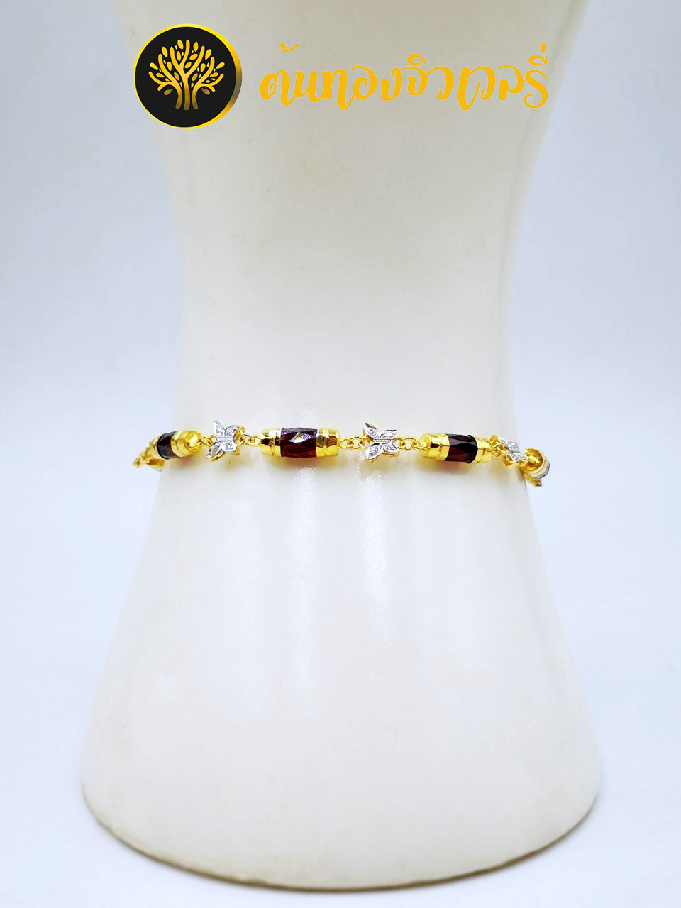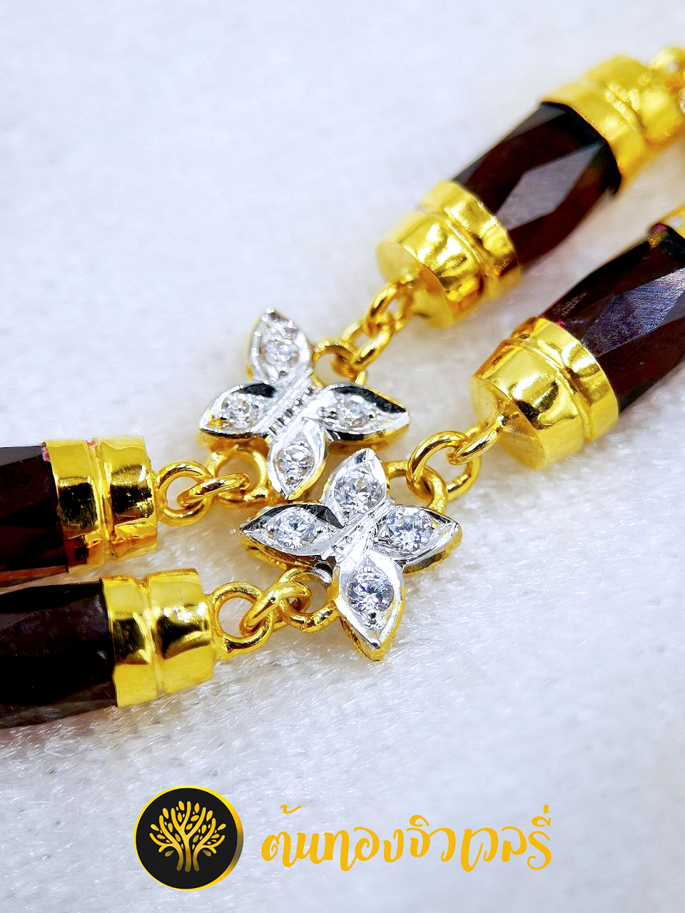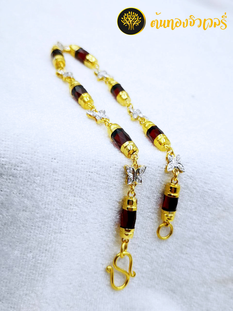 สร้อยข้อมือโกเมนทองคำแท้คั่นด้วยผีเสื้อฝังเพชรcz