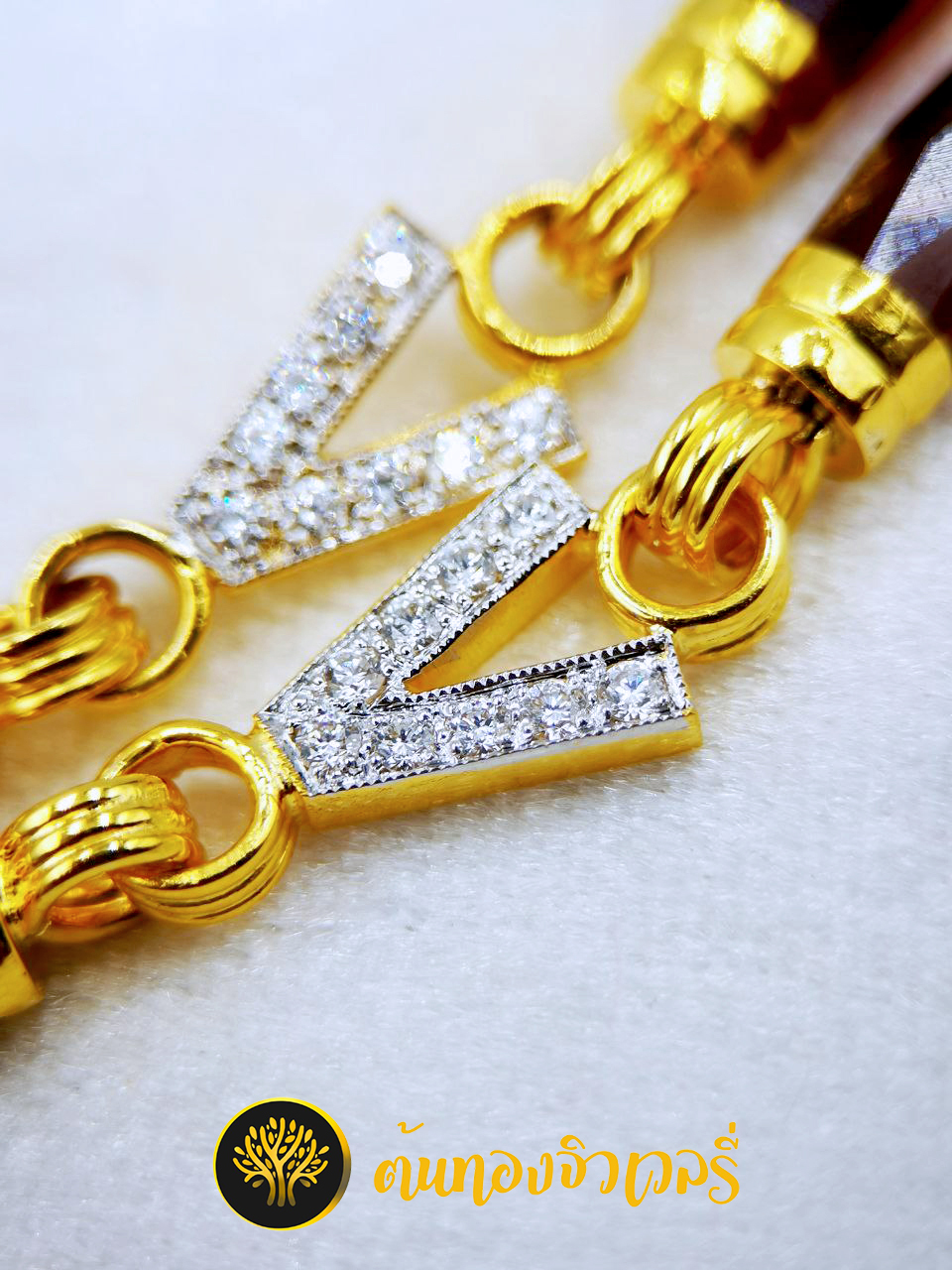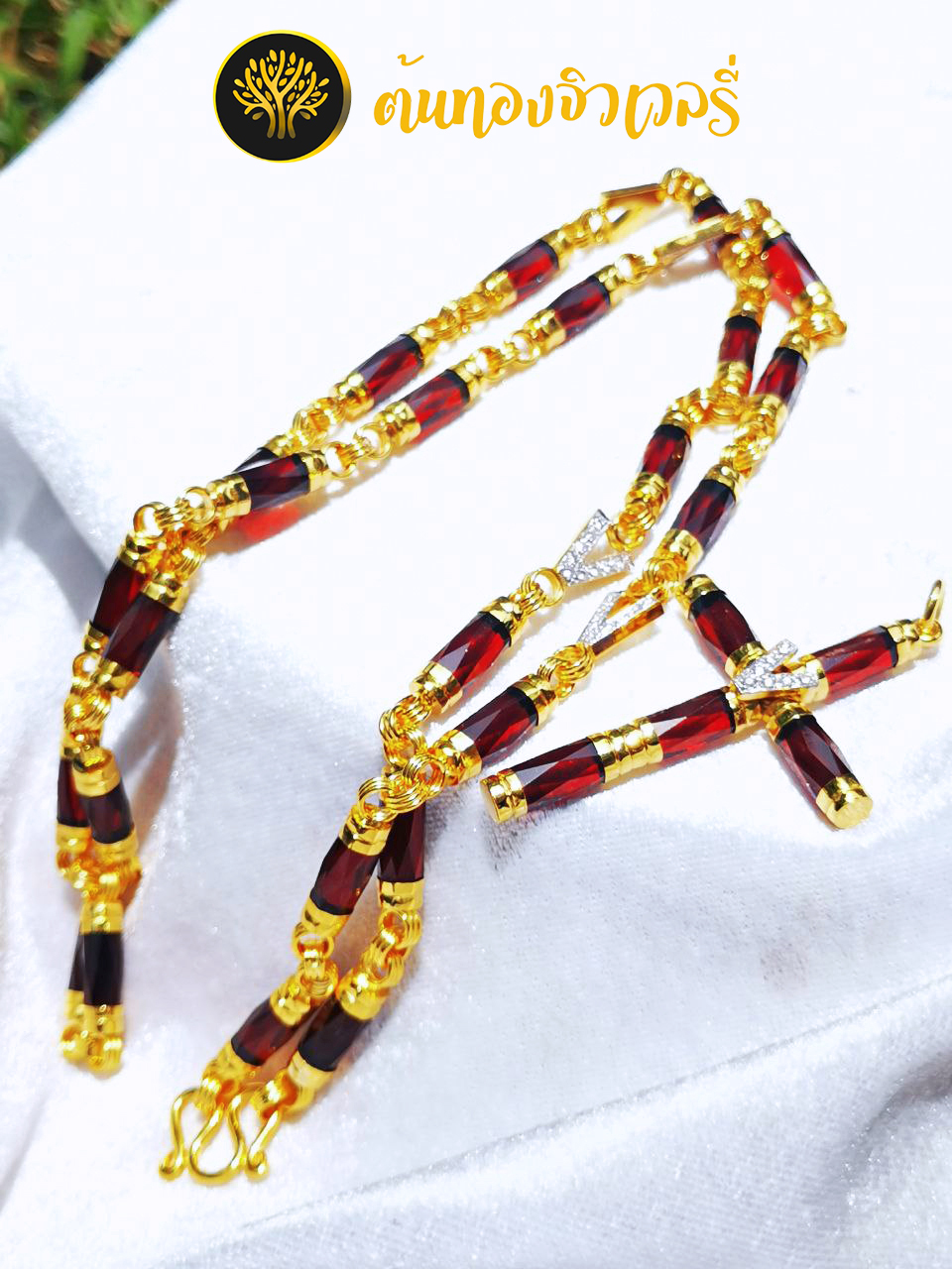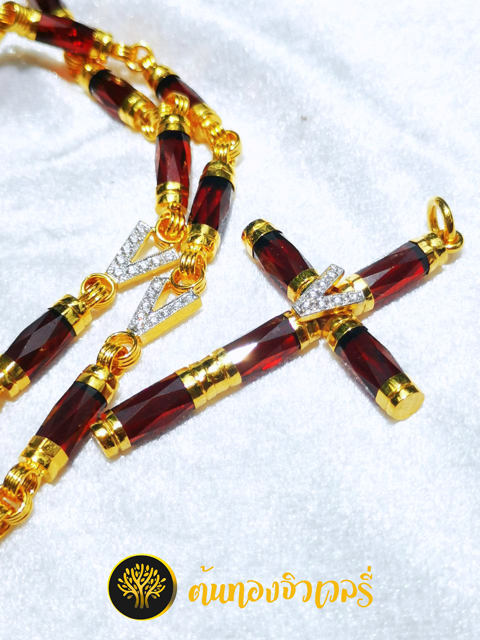สร้อยคอโกเมนคั่นด้วยตัวVฝังเพชร+จี้ไม้กางเขนที่ติดตัวVฝังเพชร ดูเข้าเซ็ทสวยสุดๆ