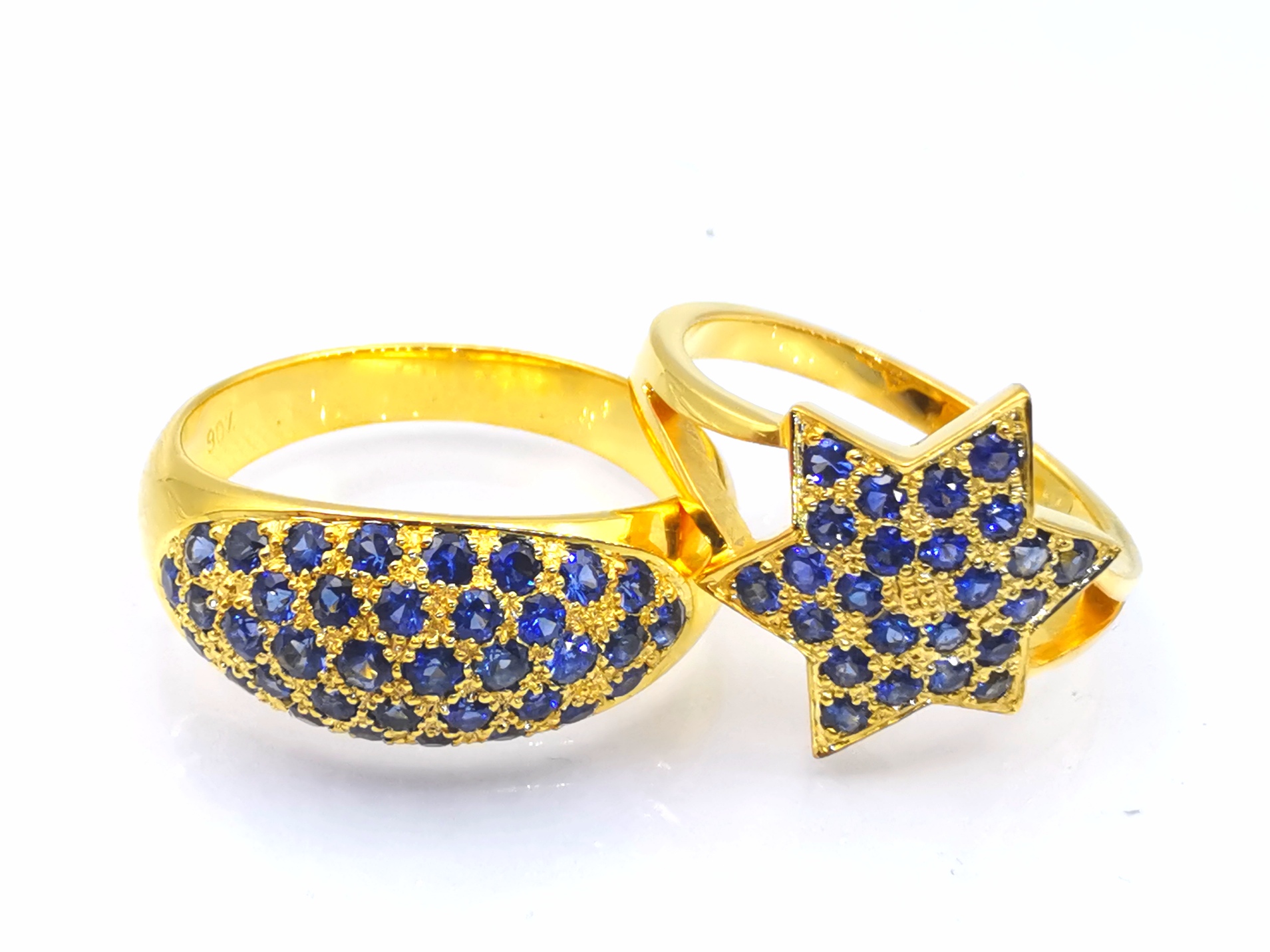 แหวนคู่พลอยน้ำเงิน ทำจากทอง90% ประดับด้วยพลอยน้ำเงินน้ำใสสีสวยจากจันทบุรีซึ่งเป็นแหล่งรวมพลอยระดับประเทศ แหวนชายน้ำหนักทองอยู่ที่ 1สลึงครึ่ง แหวนหญิงน้ำหนักทองอยู่ที่ 1 สลึงครับ